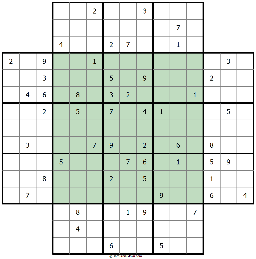 • 花数独由5个9x9数独组成,类似于武士数独。然而,这些谜题相互重叠的程度远远超过武士。中心网格被剩下的四个子谜题完全覆盖。