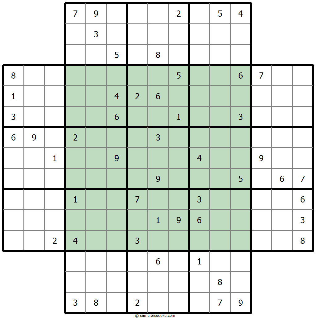• 花数独由5个9x9数独组成,类似于武士数独。然而,这些谜题相互重叠的程度远远超过武士。中心网格被剩下的四个子谜题完全覆盖。